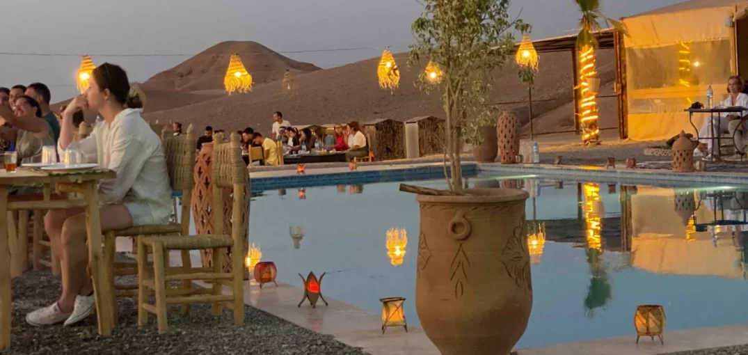Trip from your resort to discover the Marrakech desert, called the Agafay desert, on camel backs far from the souks and loud places of Marrakech. Enjoy a beautiful and peaceful sunset while you are on a Camel back. After that a delicious meal will be served as Dinner in Agafay Desert Camp with some local Music entertainment.